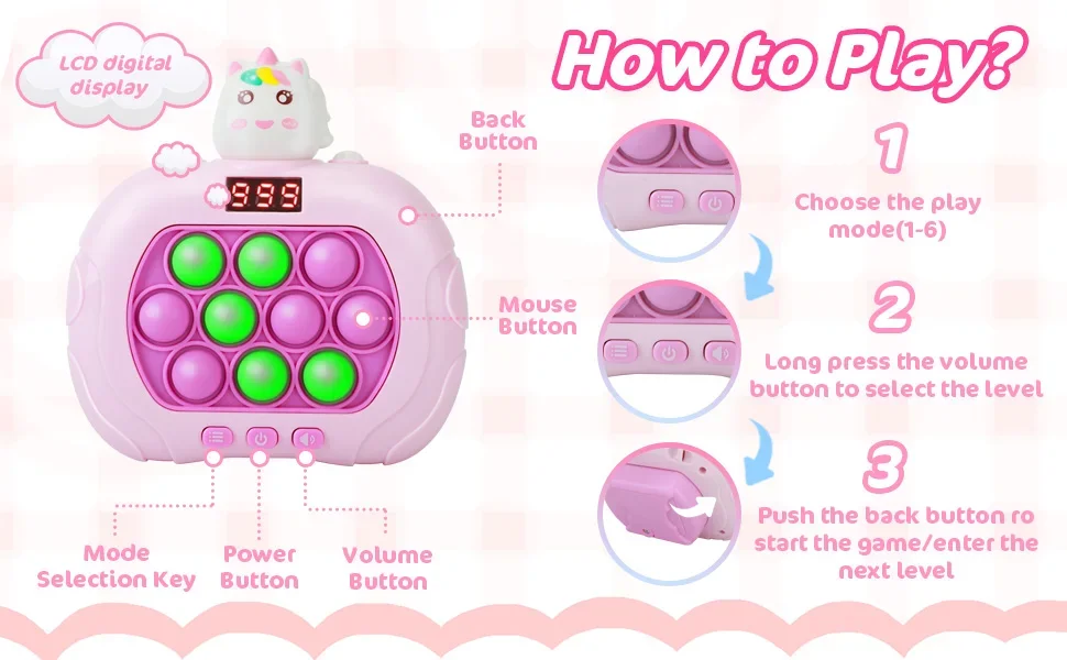 3. After the game starts, 2-3 LED indicator lights will randomly light up. Please quickly press the silicone bubble and turn off the LED indicator light, then press the confirmation button on the back to enter the next level of the game.